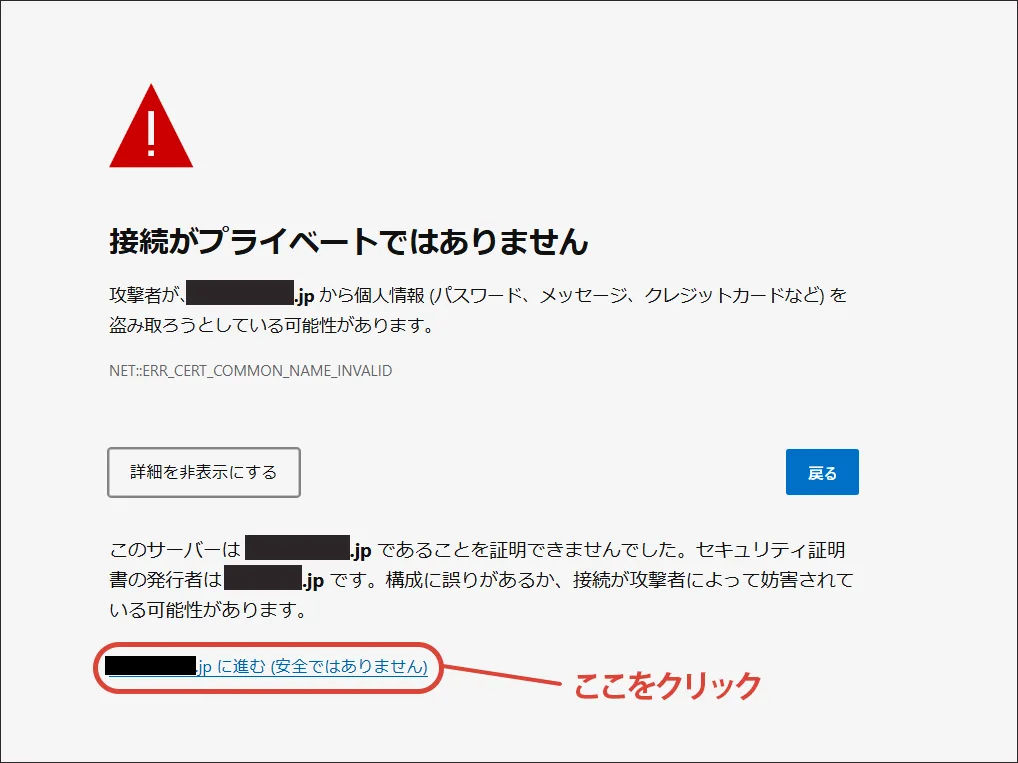 完了通知にあるURLにアクセスするとセキュリティ警告の画面が表示されますので、右下の「詳細へ進む…」をクリックします。
